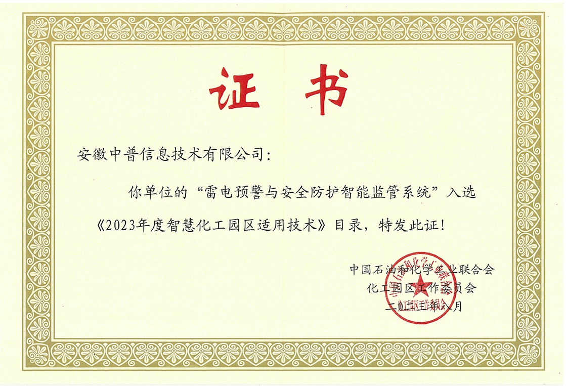 在近200個申報項目中,經(jīng)過專家多輪評選和答辯,中普科技“雷電預警與安全防護智能監(jiān)管系統(tǒng)”技術(shù)脫穎而出,成功入選2023年度智慧化工園區(qū)適用技術(shù)目錄。