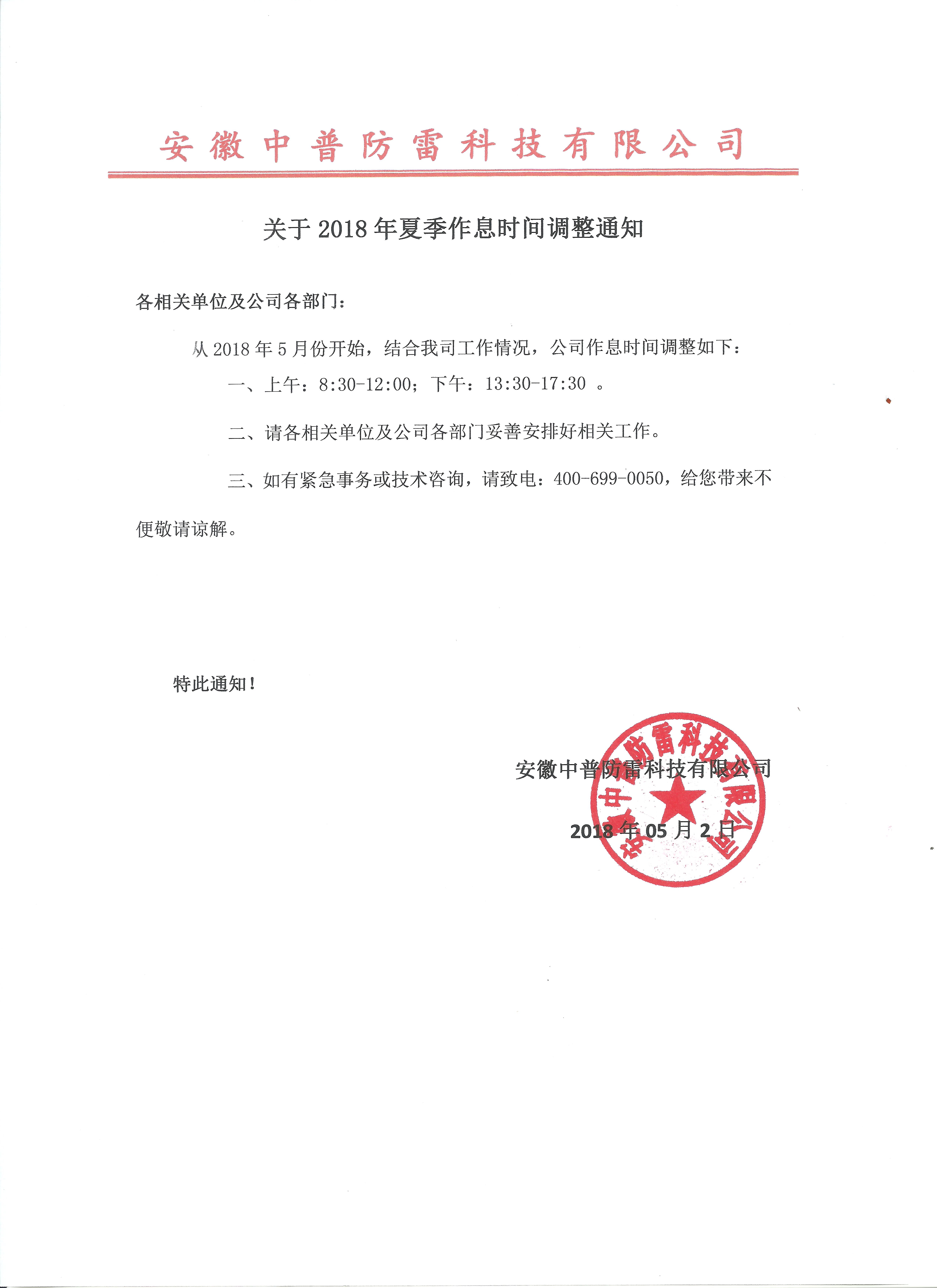 安徽中普防雷“關(guān)于2018年五一放假通知”