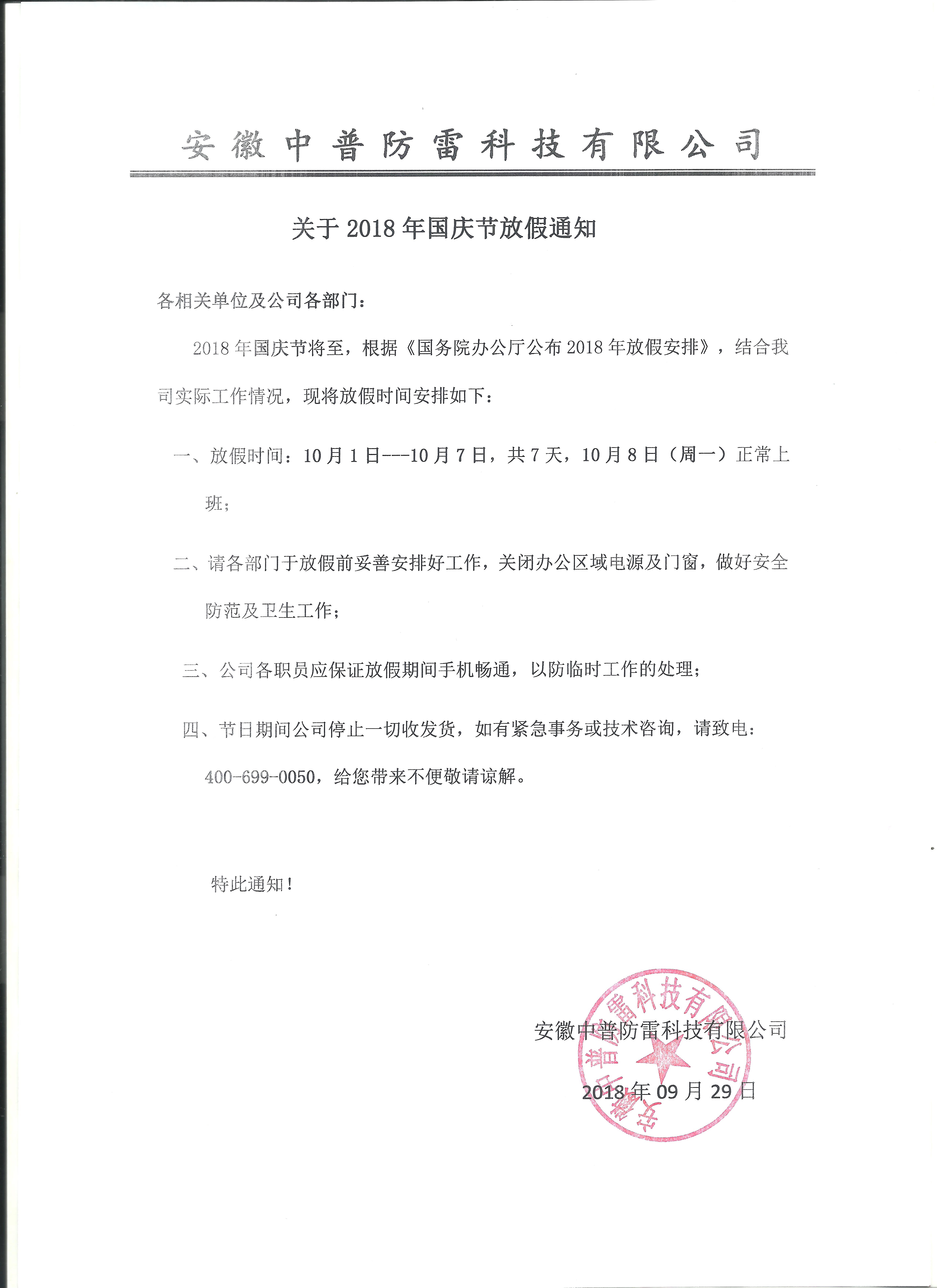 安徽中普防雷“關(guān)于2018年國慶節(jié)放假通知”