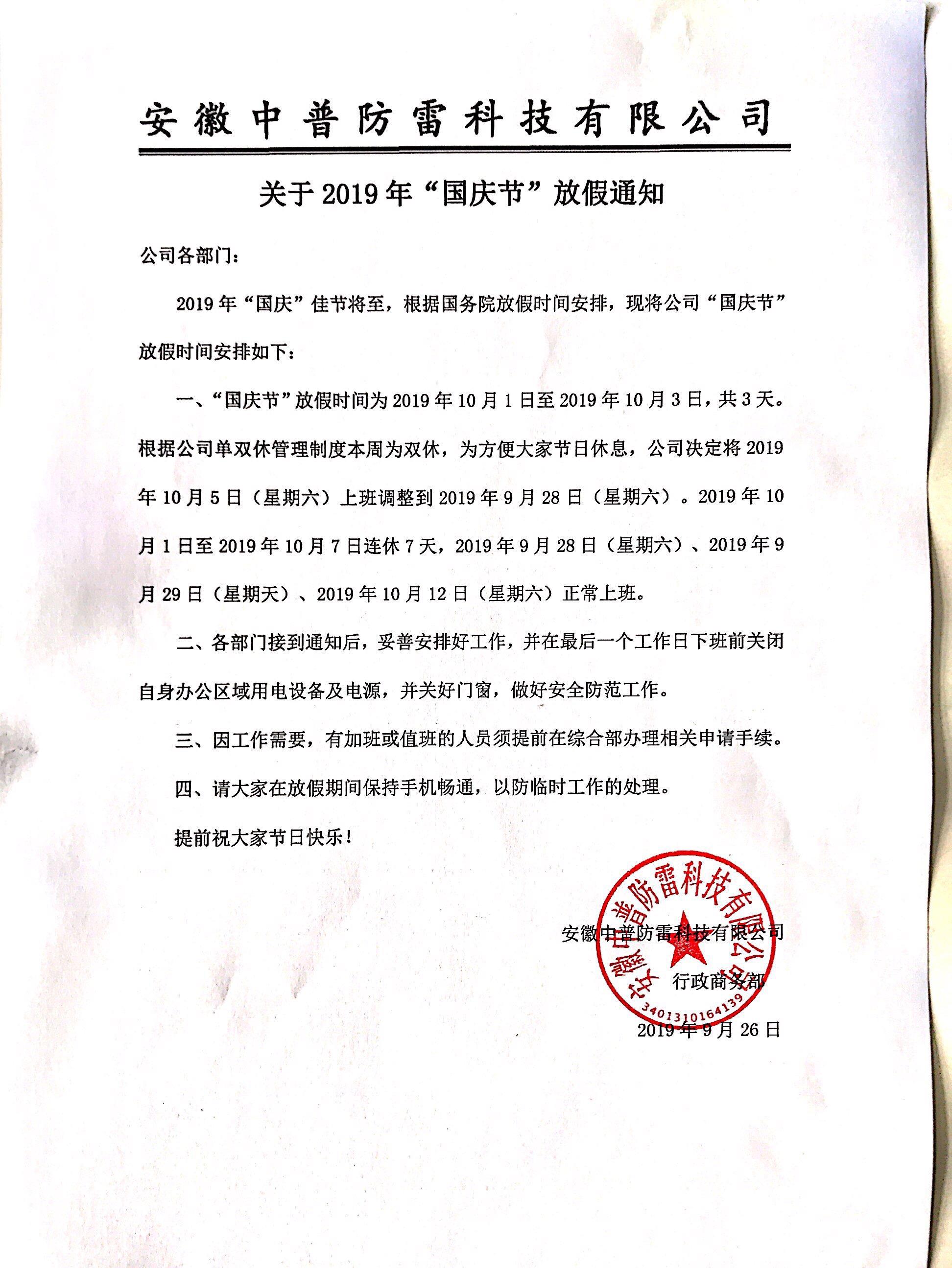 安徽中普防雷“關(guān)于2019年國慶節(jié)放假通知”